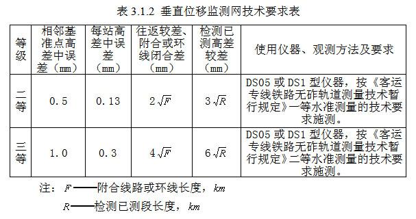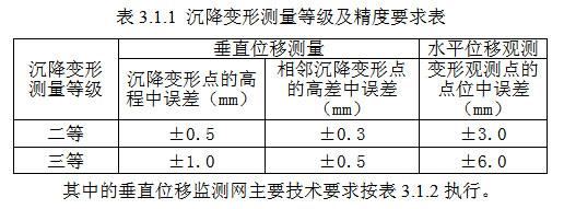 根据设计要求和现行国家《工程测量规范》、《建筑物变形测量规程》、《客运专线铁路无砟轨道铺设条件评估技术指南》(铁建设[2006]158号)和《国家一、二等水准测量规范》(GB12897—2006)对沉降观测的各项规定,结合本标段具体的情况和特点,要求本线沉降变形测量等级及精度要求按表3.1.1执行。