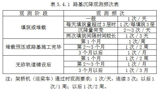 以路基观测精度及频率为例:路基沉降观测水准测量的精度为±1.0mm,读数取位至0.1mm;剖面沉降观测的精度应不低于8mm/30m。 路基沉降观测的频次不低于表3.4.1的规定。